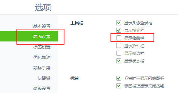 2、在选项中的【界面设置】中勾选【显示收藏栏】即可