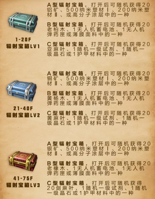 为了鼓励大家多多参与救援,每日完成指定救援任务,还可获得辐射宝箱奖励。除了固定的新币和技能点以外,还有三种等级的辐射宝箱可以领取。