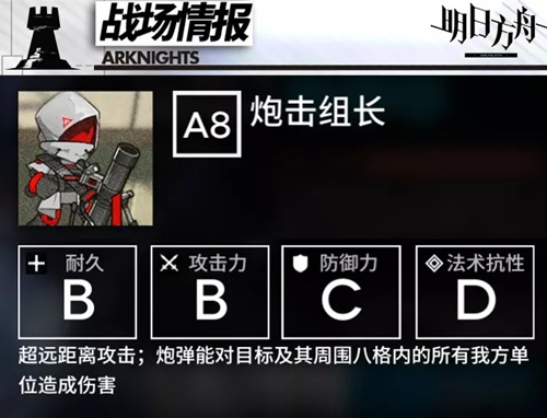 除了浮士德之外,本次整合运动还将会出动炮击组长进行偷袭,炮击组长与浮士德一样拥有超远距离打击我方干员的能力,并且它还将对攻击目标附近八格内所有我方干员造成伤害。因此不单只需要巩固防线,派遣重装干员承受其炮击,还需要注意受攻击干员身边最好不要有其他我方干员。