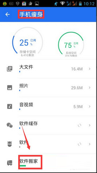 2、【手机瘦身】的页面,点击【软件搬家】。