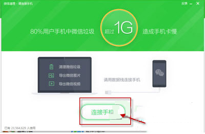 点开之后,需要你使用USB连接手机,点击“连接手机”之后,就能够连上手机开始清理微信啦!