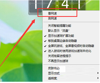 第一步:首先,我们需要在在即的win7旗舰版电脑中打开360软件,之后,我们找到桌面的浮动窗口,也就是其中显示上传下载速度的那个窗口并右键点击,在弹出来的菜单中,我们选择看网速选项。