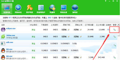 第二步:单击“看网速”以后会出现“360流量防火墙”窗口,在该窗口我们找到占用带宽比较多的软件,并找到该软件后面有一个类似于“扳手”的设置管理的按钮并单击,在出现的窗口中我们就可以看到限制上传下载速度的选项了。