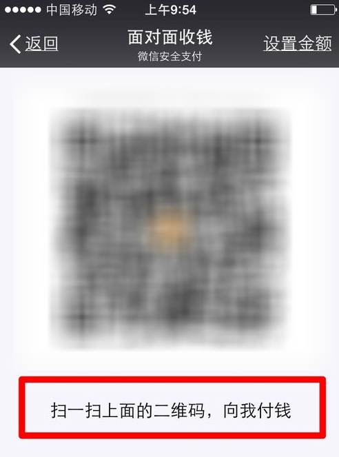 4.进入界面以后,发现面对面收钱的二维码已经创建成功,但是我们要的不是没有下限的打赏,所以找到页面右上角的“设置金额”按钮,并点击进入下一步。