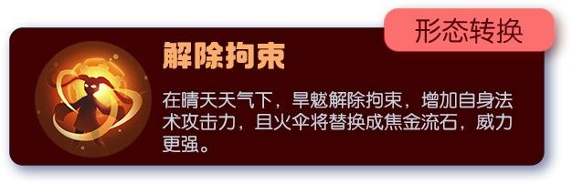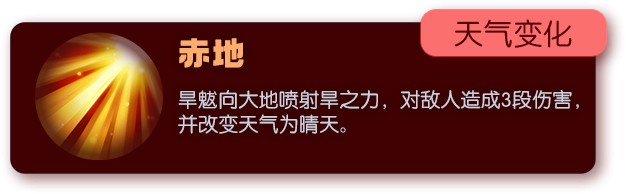 而当天气变为非晴天时,旱魃会变回拘束形态,这时需要使用2技能【赤地】改变天气,再使用晴天状态的1技能进行输出。