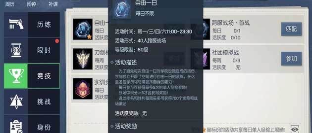 在每周的周一、周三、周四、周六,等级达到50级的玩家,可以参与跨服战场中的自由一日玩法。需要注意的是,自由一日跨服战场活动在开放日的中午11:00到晚上23:30期间才可以参加。