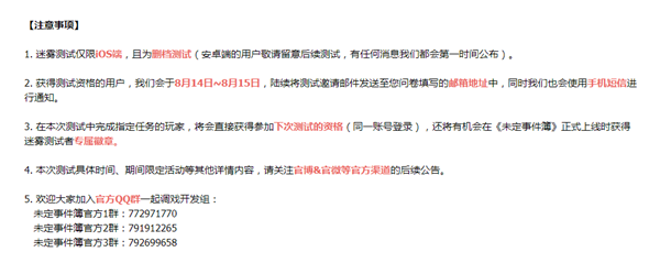 根据报名问卷最末尾关于发放通知的时间段说明、以及官方贴吧中分享活动的截止日期在8月15日,大致可以推出至少在下月15之前不会开测,但具体的开测时间应当离那也不会太远。