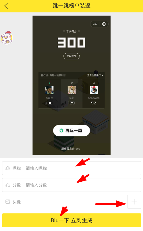 3、接着通过输入自己的“昵称”和“分数”,上传自己的头像。点击下方的“Biu一下”选项,就能够直接完成P图了。