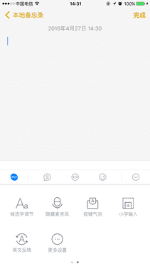 和其它输入法不同,讯飞输入法将语音输入的图标放置在了键盘面板上,点击左下角的话筒,接着说出想说的内容就行了。在这里注意一下,由于苹果系统的限制,语音输入无法在当前界面中完成,必须要转跳至语音面板,所有输入法均需按此过程操作。