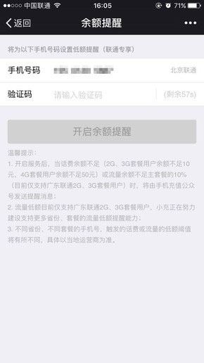 进入微信-钱包-手机充值,在界面最下方找到“余额提醒”选项(注意暂时仅支持联通4G套餐用户),开启这项服务后,当话费余额不足时,将通过手机充值公众号发送提醒消息,相比通过短信提醒,显然这种方式更加符合用户使用习惯。