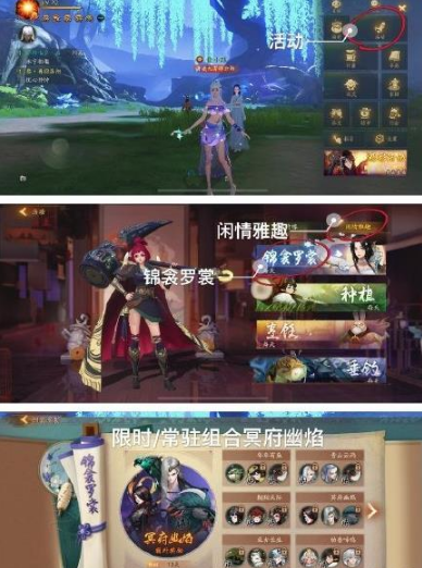 活动-闲情雅趣-锦裘罗裳,本次限时皮肤组合冥府幽焰是从常驻组合中挑选的,需要解锁金乌觉醒皮幽焰蚀日+ 大司命觉醒皮裂世魔枭+ 兕染色皮雷火,可以得到限时和常驻奖励共唤灵符×4+剧情ssr碎片礼包特×10。