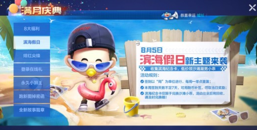 在8月5日游戏将迎来海滨假日的全新主题,玩家朋友们只需要收集海滨纪念卡,就能用很便宜的价格获得沙滩潮男小乖这个角色,玩家朋友们每周都能领海滨假日卡,当收集到一定的数量后就能获得潮男小乖。