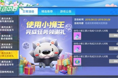 在小狮王的谢礼这个任务中,大家只需要用小狮王完成对局就能获得超多的能量水晶,这个道具可以用来升级赛车用,现在满月庆的活动非常多,想要获得一辆新的赛车其实并不是很难哦,另外最后的任务完成后可以给588的酷币还是相当划算的,大家不用可以去刷这个任务,做别的任务顺带就能完成小狮王的谢礼了,今天跑跑卡丁车手游小狮王谢礼任务攻略就介绍到这里。