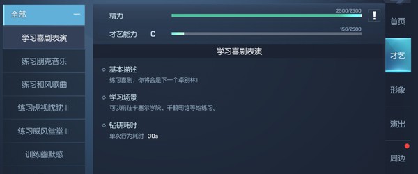 想要提高自身的才艺能力、形象气质、以及演出能力,玩家就需要不断的学习相关知识。如玩家想要提高自身的才艺能力,就可以通过接取观看海草舞教学、学习声乐知识、练习绕口令等很多任务并完成来实现。每次完成任务的时候都是需要玩家消耗一定的精力值以及时间的。如观看海草舞教学就需要消耗玩家6点精力以及30秒的时间。