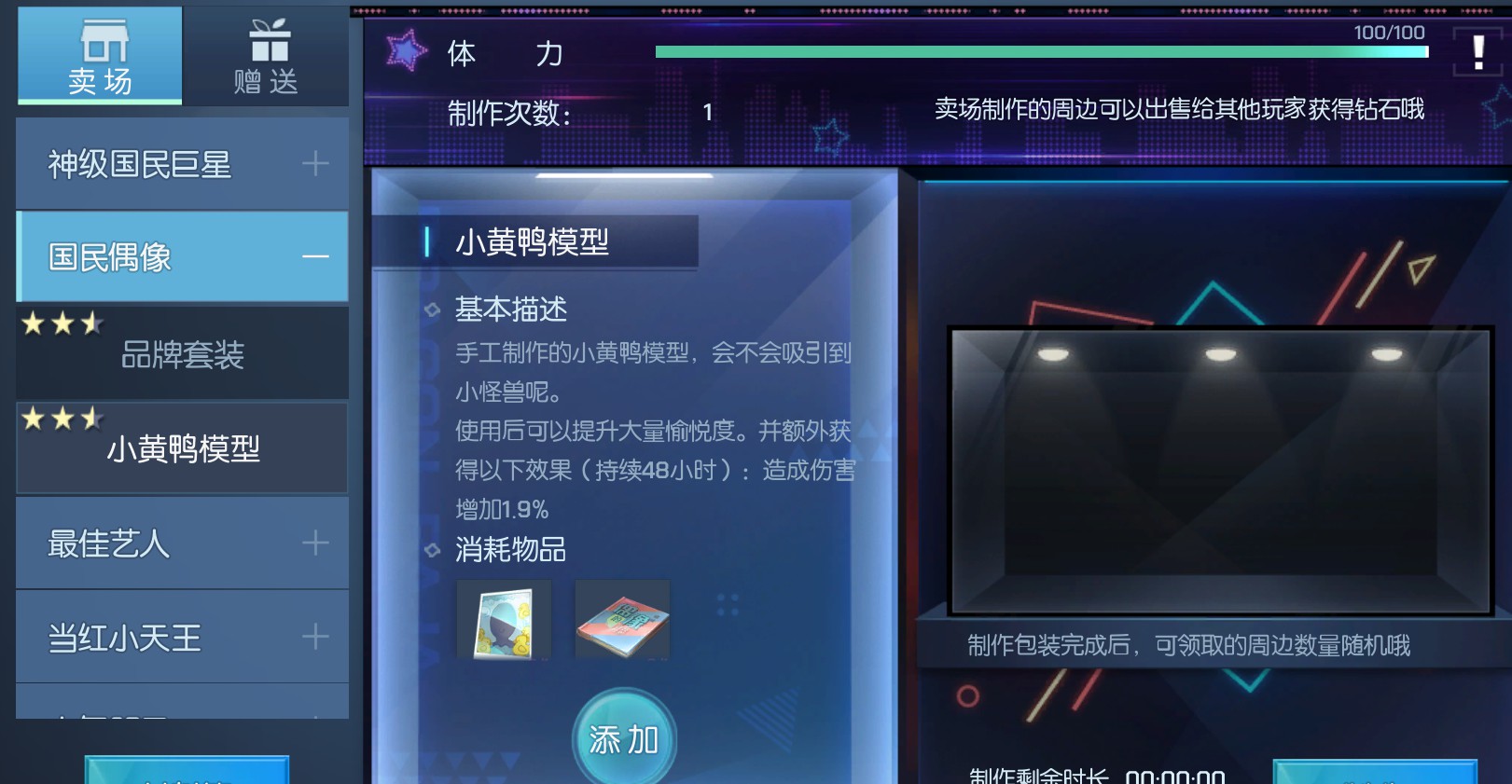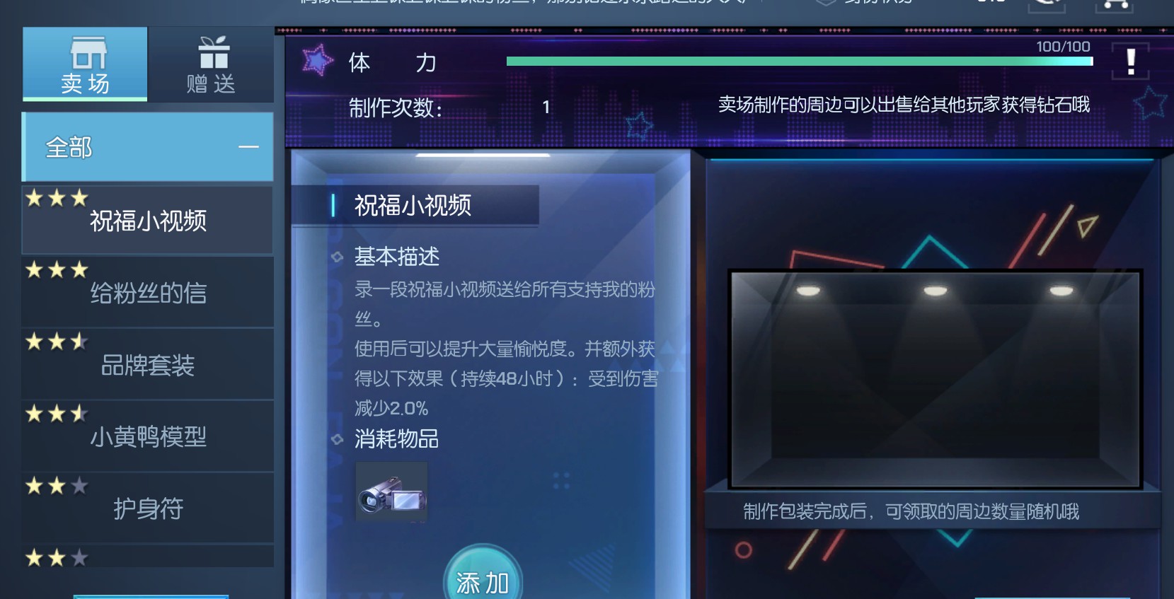 此外,玩家在巨星玩法中达到不同的等级还能够制作不同的周边。如身份等级为海选艺人的玩家可以消耗相应的制作材料制作明信片以及大头贴。而对于制作好的周边如明信片,玩家可以自己使用提高相应的属性值,也可以上架到店铺换取对应的钻石。
