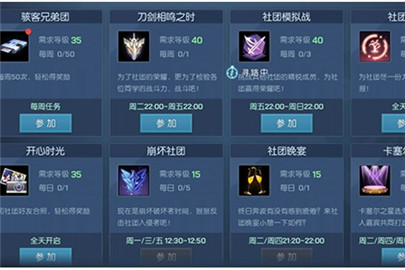 游戏中每天在不同的时间会开启不同的活动,有些是每天的一个固定时间开放,有些是一周中的某几天的固定时间开放,比如只有在周五22:00至周日22:00开放的社团模拟战,每次活动结束后,不论是哪方获胜,参与社团模拟战的玩家都能够领取大量的奖励,奖励包括经验、金币、龙文祭符、社团之力。