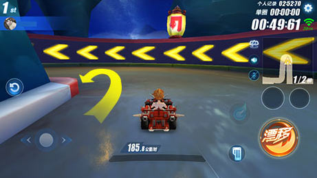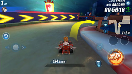 提前使用氮气加速,空喷落地喷斜飞到前方道路。落地后可以用侧身漂移避免撞墙,同时集满氮气,若是不小心撞墙,也可以使用撞墙点喷提速,接着小漂集出氮气,保证下一个cww喷。