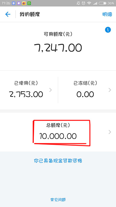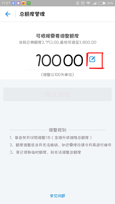 点击【总额度】后输入调整额度,每个自然月可调整1次,操作后就无法撤销,如果领取了临时额度,无法调整总额度,花呗额度最低调整不低于500元。