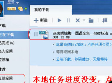 一段时间后,打开迅雷,任务是暂停的(进度还是我关闭迅雷时候的进度),点击离线空间