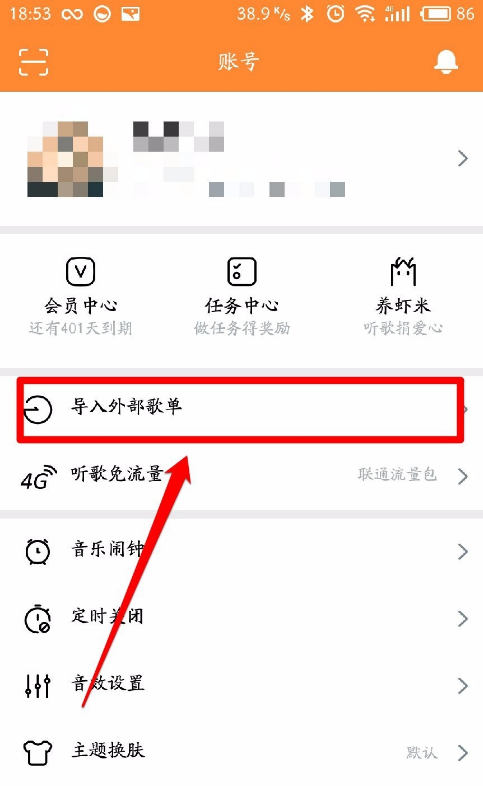 5、然后,我们打开虾米音乐APP,点击底部的“账号”按钮,在账号界面中找到“导入外部歌单”项目并打开它,