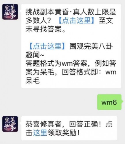 完美世界微信公众号每天都会更新新的问答,玩家正确回答便可获取相对应奖励,8月6号的问题是:挑战副本黄昏·真人数上限是多数人?不知道答案的小伙伴快来跟小编一起往下看看吧!注意答题格式哦!否则即使答对了也没有奖励的!