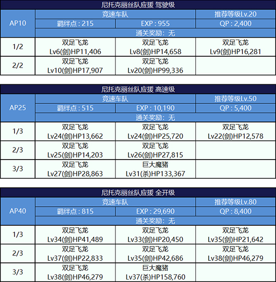 本次活动副本分为10~40AP四个难度,竞速阶段只开放前三个难度,打最高的火力全开级即可。