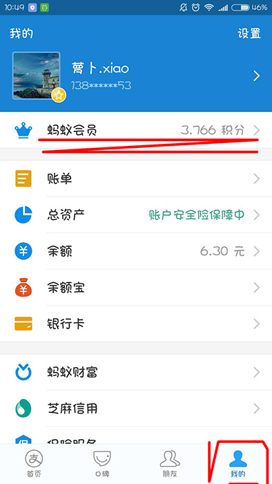 1、首先登陆手机支付宝,在支付宝右下角点击我的,然后点击进入“蚂蚁会员”如下图所示