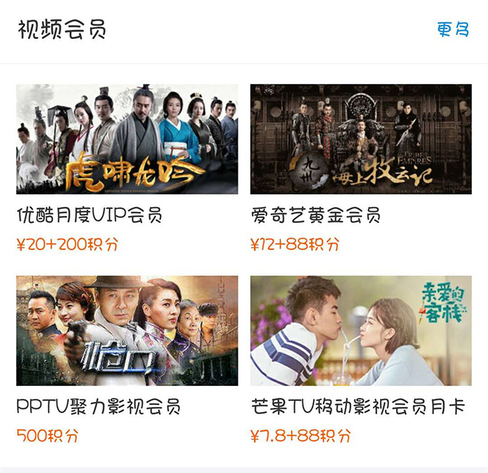 优酷月度VIP会员、爱奇艺黄金会员、PPTV聚力影视会员、芒果TV移动影视会员月卡、搜狐视频会员月卡、芒果TV移动影视会员季卡、乐视乐次元月卡、优酷VIIP会员买三赠一等。
