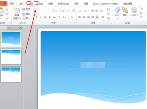 1、点击打开幻灯片,点击菜单栏中的“设计”。