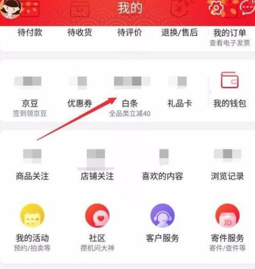 2、在我的页面中间部分找到【白条】功能,点击进入;