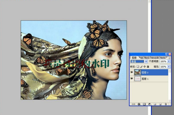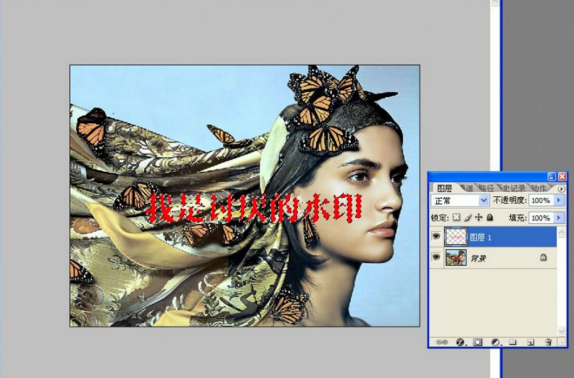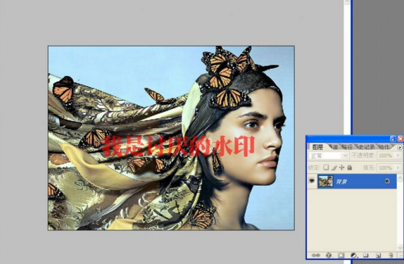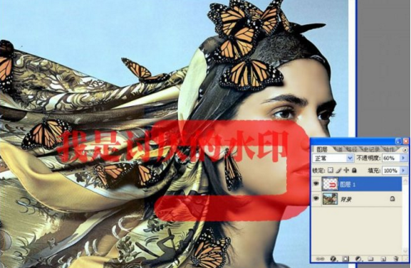 2、我们看一下颜色和透明度,我们新建一层,画上红色的水印来调整透明度,看看在什么数值的时候,和图片的效果像近;