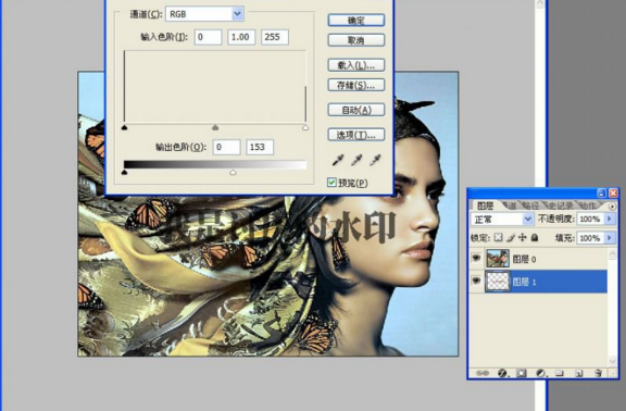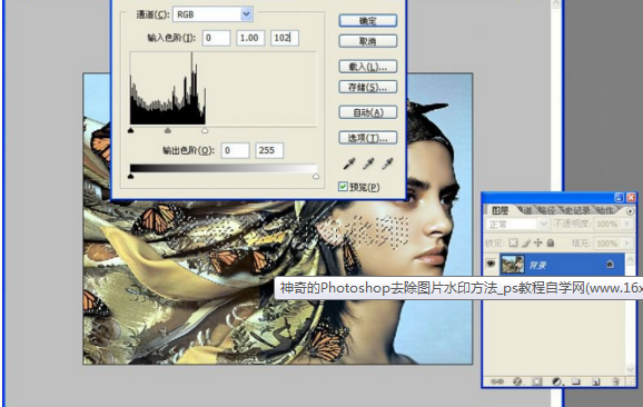 6、拼合图层,载入水印选区,调整输出色阶为255×(1-60%)=102;