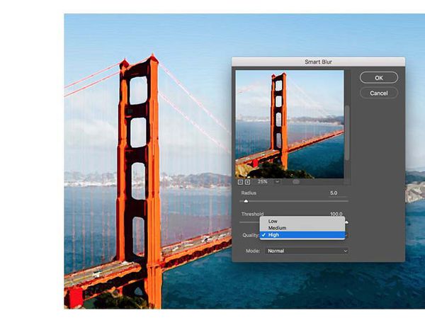 5、依次点击【滤镜】-【模糊】-【特殊模糊】设置参数:半径5,阈值100,并将"质量"更改为"高";