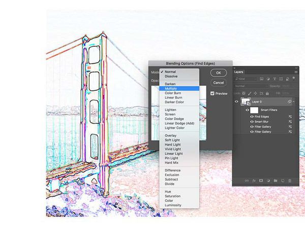 7、依次点击【滤镜】-【风格化】-【查找边缘】,编辑混合选项并将混合模式更改为【正片叠底】使背景通透;