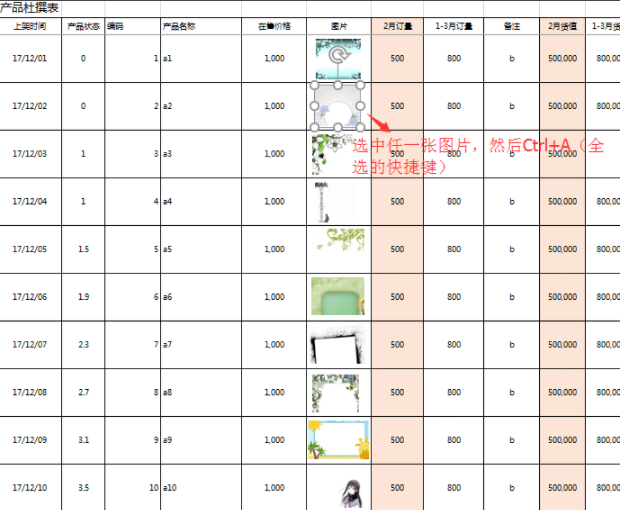 3、先选中任一张图片然后ctrl+a便可选取当前表格中的所有图片;