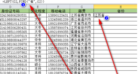 1、选择H2单元格并输入公式【=LEFT(G2,FIND(“省”,G2))】,按下键盘上的回车键计算出结果;
