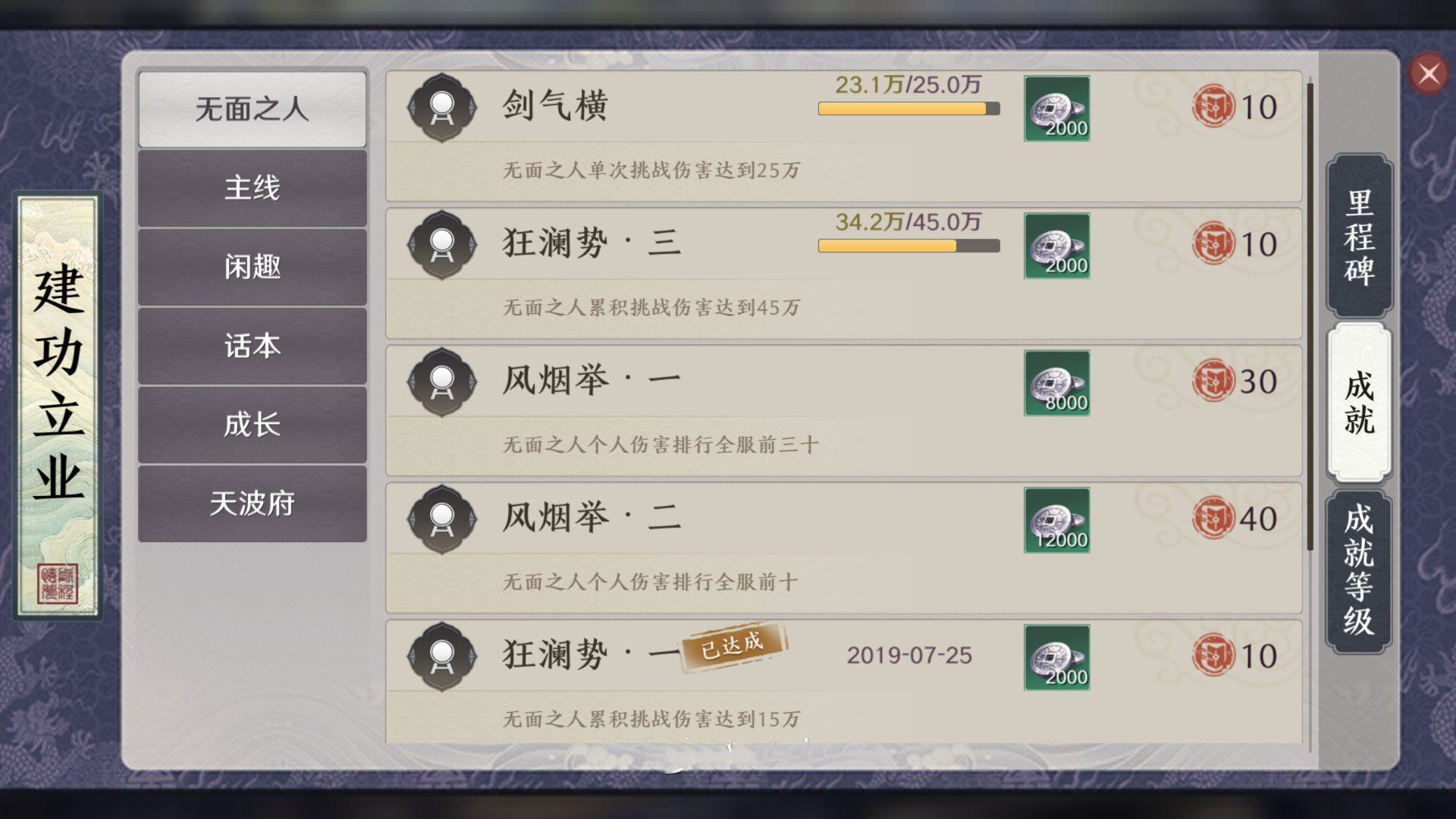 建功立业主要跟pve有关,完成主线,副本天波府等特殊要求可获得不同的成就点