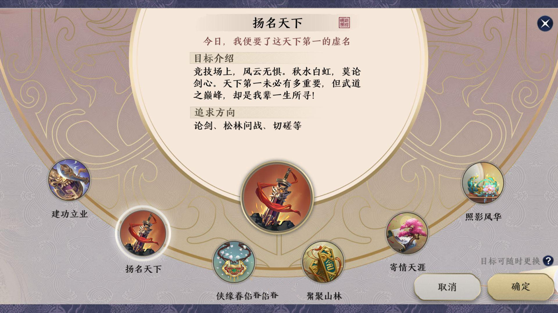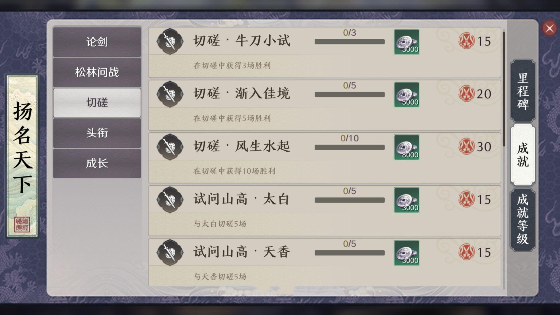 扬名天下就是跟pvp有关了,参加多少论剑,松林问战或者切磋,又获得多少胜利,又或者限时内胜利都可以获得不同的成就点。头衔则是参与天波府获得,成长即心法收集。