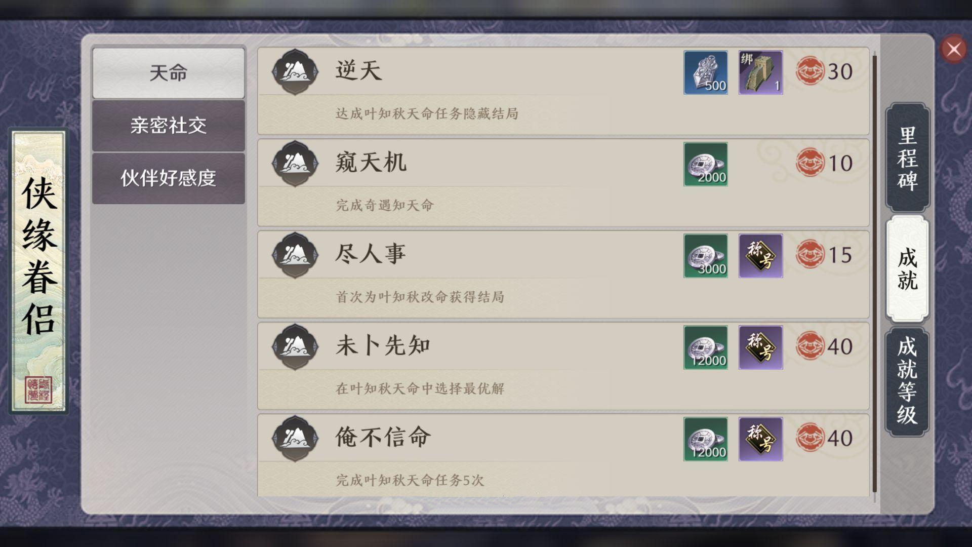 侠缘眷侣主要是跟伙伴的互动,也就是好感系统。可以通过约会、信件、互动和分享来提高伙伴好感度;当然还有玩家与玩家之间的互动,比如跟好友牵手,跟好友一起下本打松林问战等等;还有一个就是天命,目前达成条件可以为叶知秋逆天改命。
