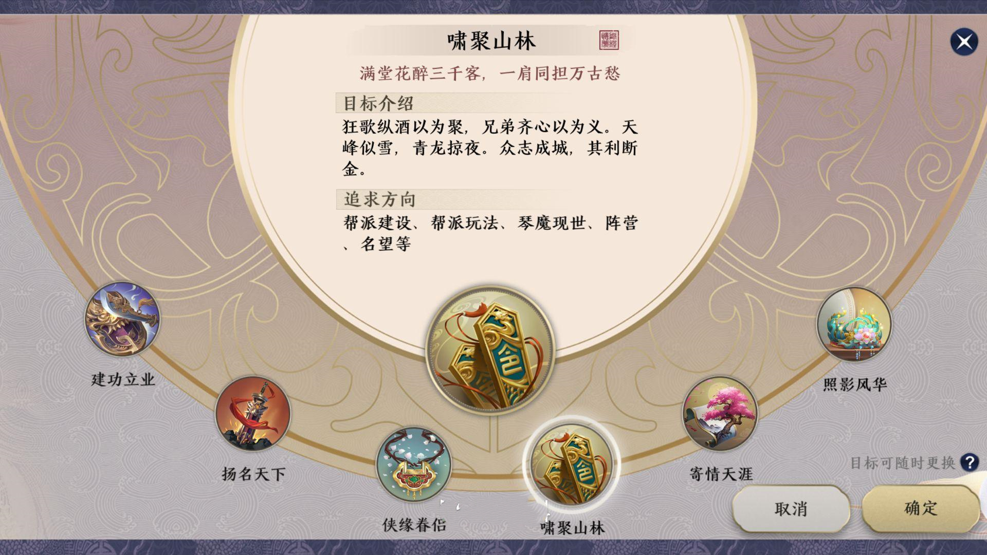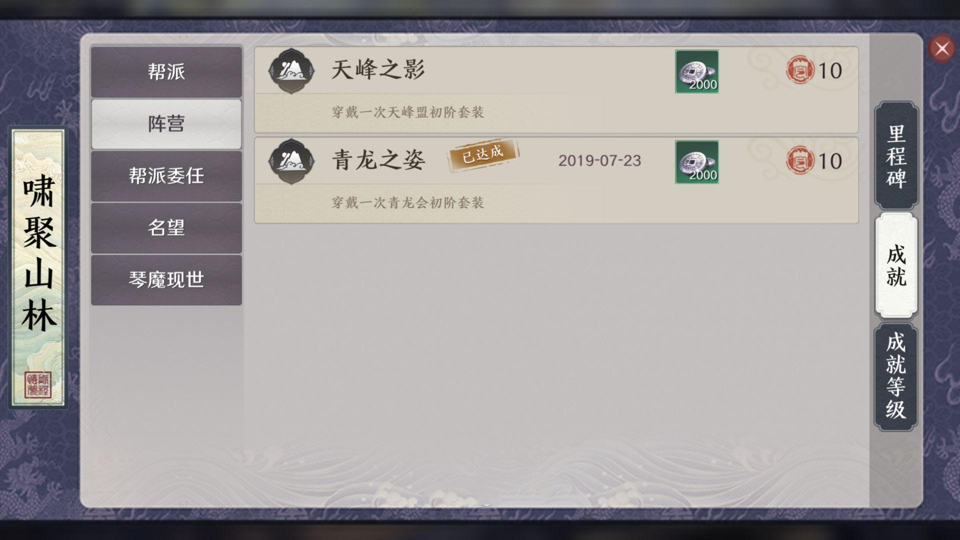 啸聚山林主要是帮派,阵营方面的。比如帮派活动,帮派委任,资历贡献,学习帮派技能,又比如选择完阵营,通过阵营可以获得名望,琴魔现世则是以帮派伤害为主。以此完成种种可以获得不同的成就点。