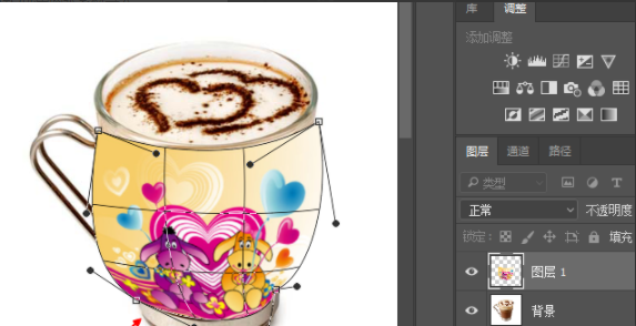 5、调完了控制点后我们就可以按下回车键确认了,现在来选择图层1打开混合模式为柔光,这样就是为了让图像贴到杯子上;