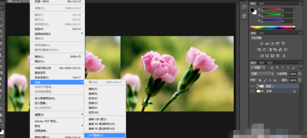 4、点击【编辑】-【变换】【水平翻转图片】,得到平面镜面影像效果图,合并图层,存储图片;