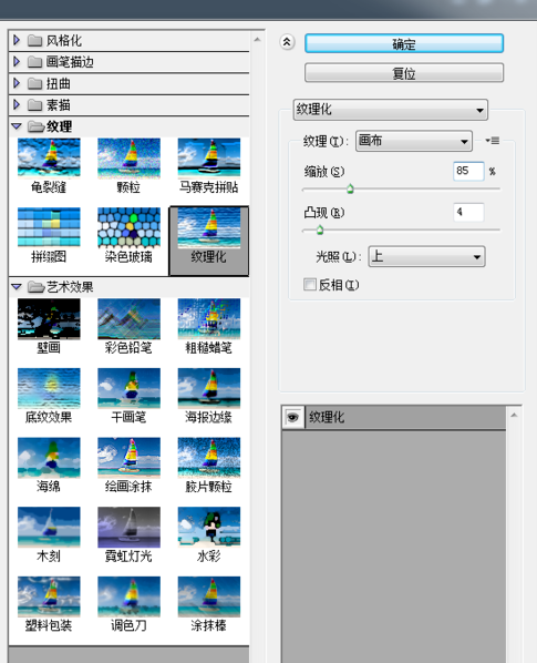 7、然后再是依次“滤镜”、“纹理” 、“纹理化”,数值如下图。