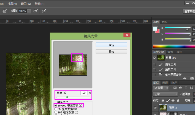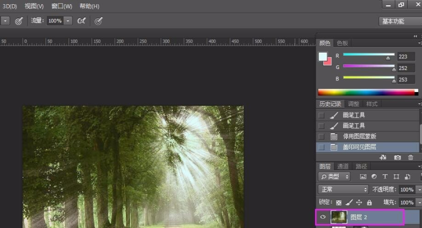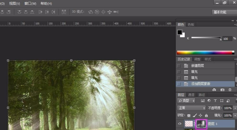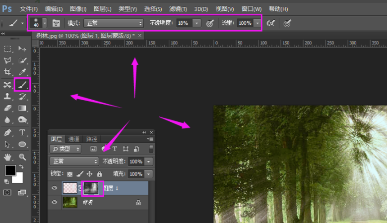 6、新建蒙版,点击蒙版,选择画笔,设置好流量、透明度,对蒙版继续涂抹,使得光线看起来不那么白;