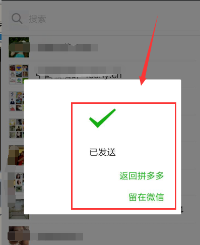 4.发送成功后,这时会看到页面提示,此页面显示有:返回拼多多、留在微信,两个按钮可根据所需点击相应的按钮。