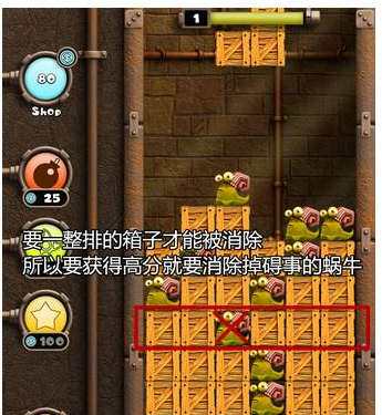 在游戏中玩家要用箱子相除获得的分数比消除蜗牛要来得多。玩家让一整排的箱子消除可以获得100分,若是两排或是两排以上还有额外的奖励分数哦!