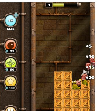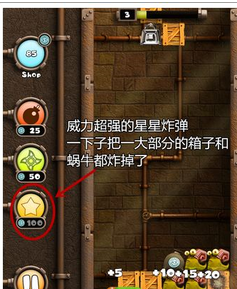 爆炸星星能够同时炸掉随机范围内的箱子和蜗牛,并且获得的分数是双倍哦,把它作为第三个推荐的道具是因为星星第一次使用需要100个金币,第二次则需要200个金币,以此类推。