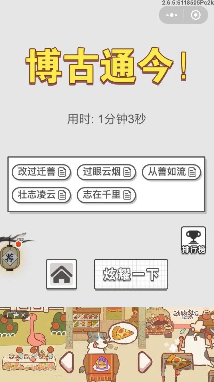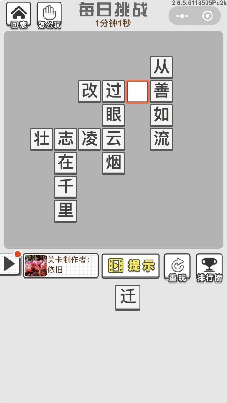 玩家根据上面的提示将每个字分为都填到上面的网格中就可以过关了,然后就会提示领取今日份的元宝,或者在不知道怎么填的时候可以使用提示功能,看过大概15秒的广告后就可以获得一个字的提示了。