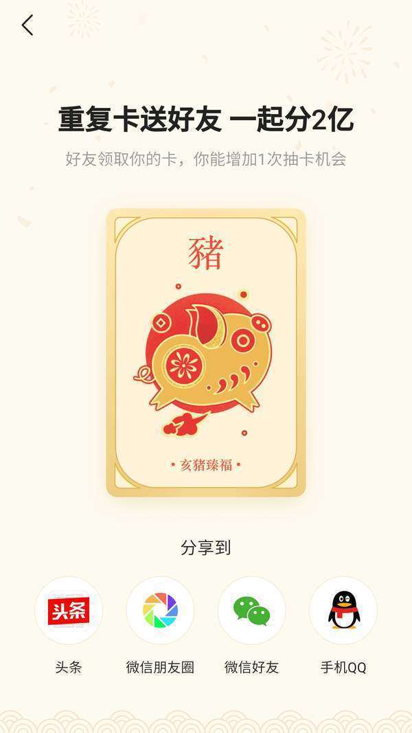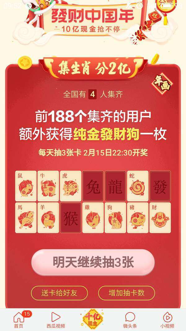 今日头条目前推出一款集卡活动,只要集齐14张生肖卡就可以获得瓜分2亿奖金的机会,我们如果有多余的卡牌还能与好友交换,但是最近有朋友反映无法收到好友的分享,那么这是为什么呢?下面就让我们一起来看看吧。