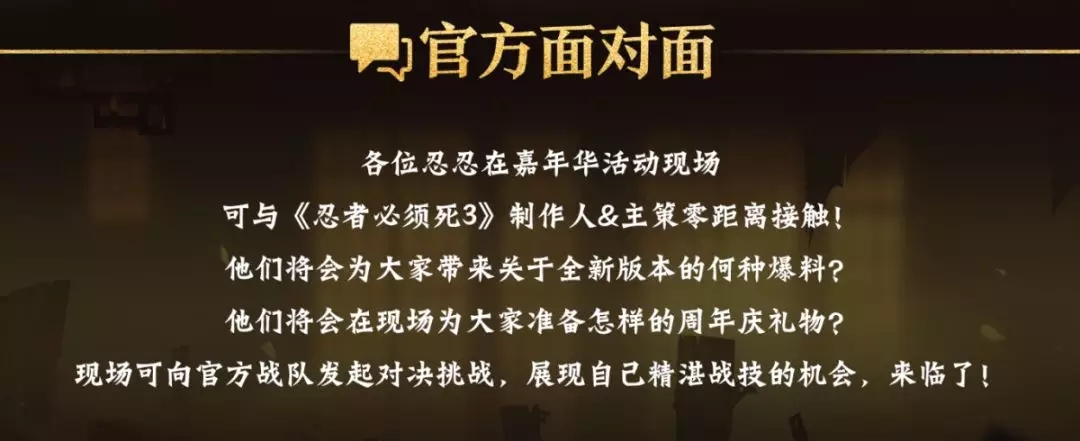 忍者必须死3首届周年庆典嘉年华活动怎么做?忍者必须死3首届周年庆典嘉年华活动攻略。终于!终于来了!这一年才能有一度的盛会,无比难得的机会,新版本资料片的揭秘,海量蓄势待发的奖励,还有堆积如山的周边……它们,会在这次盛会等着你!那么,在这个盛会上,我们都为大家准备了什么呢?